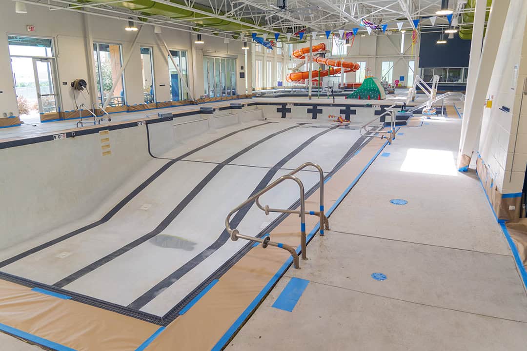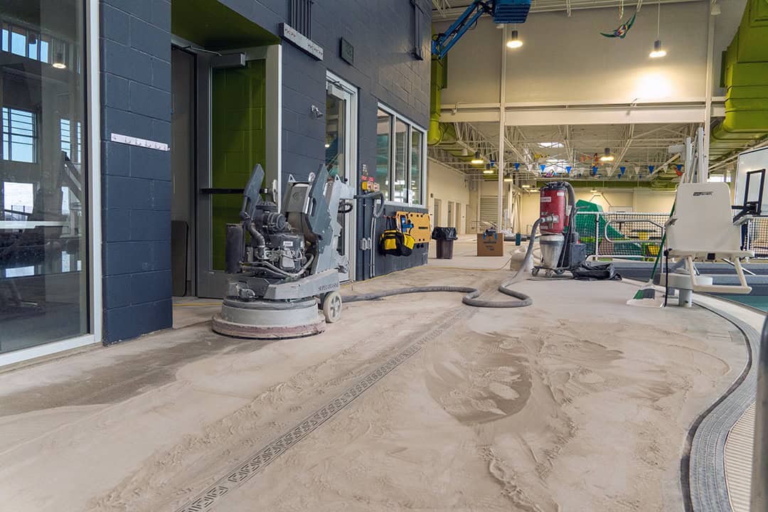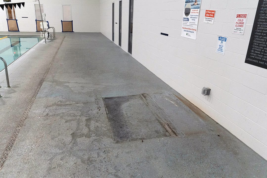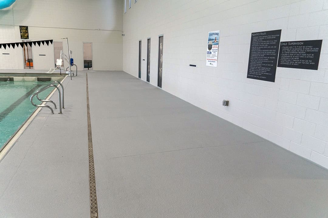 The resurfacing process began with mechanically grinding off the old coating down to clean concrete, creating a sound surface for new materials to bond. Cracks and spalled areas were repaired using semi-rigid epoxy patch gel, while elevation and slope issues near the locker room entrance were corrected with a cementitious repair mortar. Between the pool coping and drains, DCPS installed a polymer-modified cement system to adjust elevations and eliminate trip hazards.
