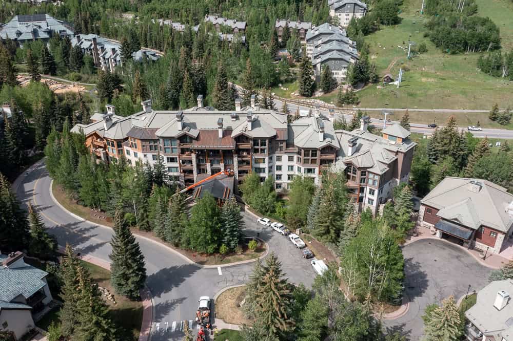 In the back, where the ski access road limited space, DCPS leveled a 180-foot boom lift to handle the upper levels. For areas beyond the reach of lifts, rope-certified painters tied into permanent roof anchors – similar to those used for high-rise window washing—to complete precision work in hard-to-access zones.
