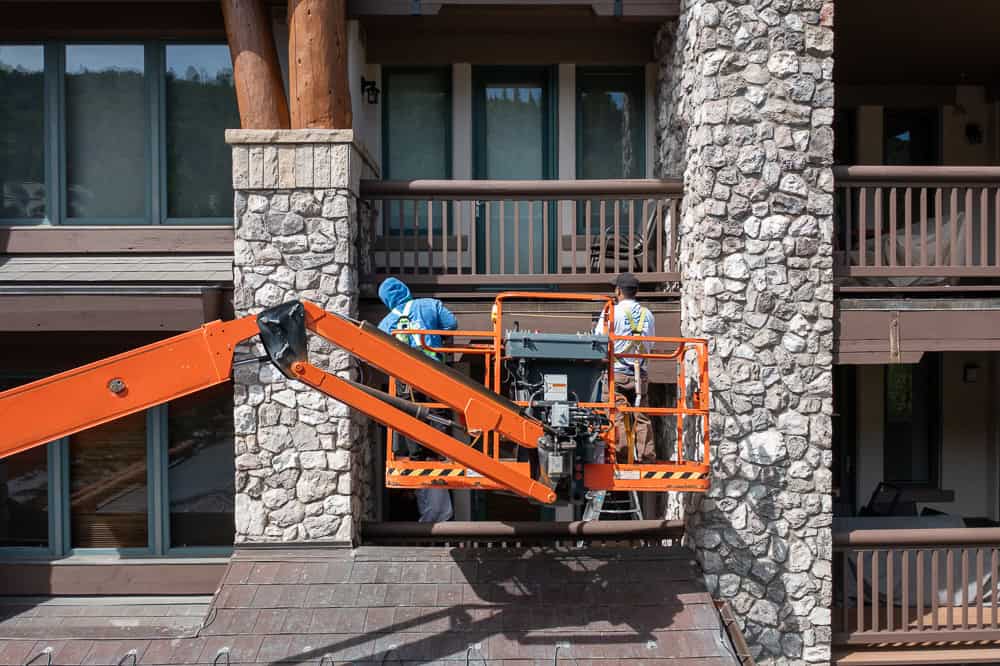 The project began with a full site evaluation to create a safe access plan for each elevation of the property. On the front, paved side of the lodge, crews deployed an 85-foot boom lift to cover most of the height. Extended 24′, 48′, and 60′ ladders were used to reach transitional areas.